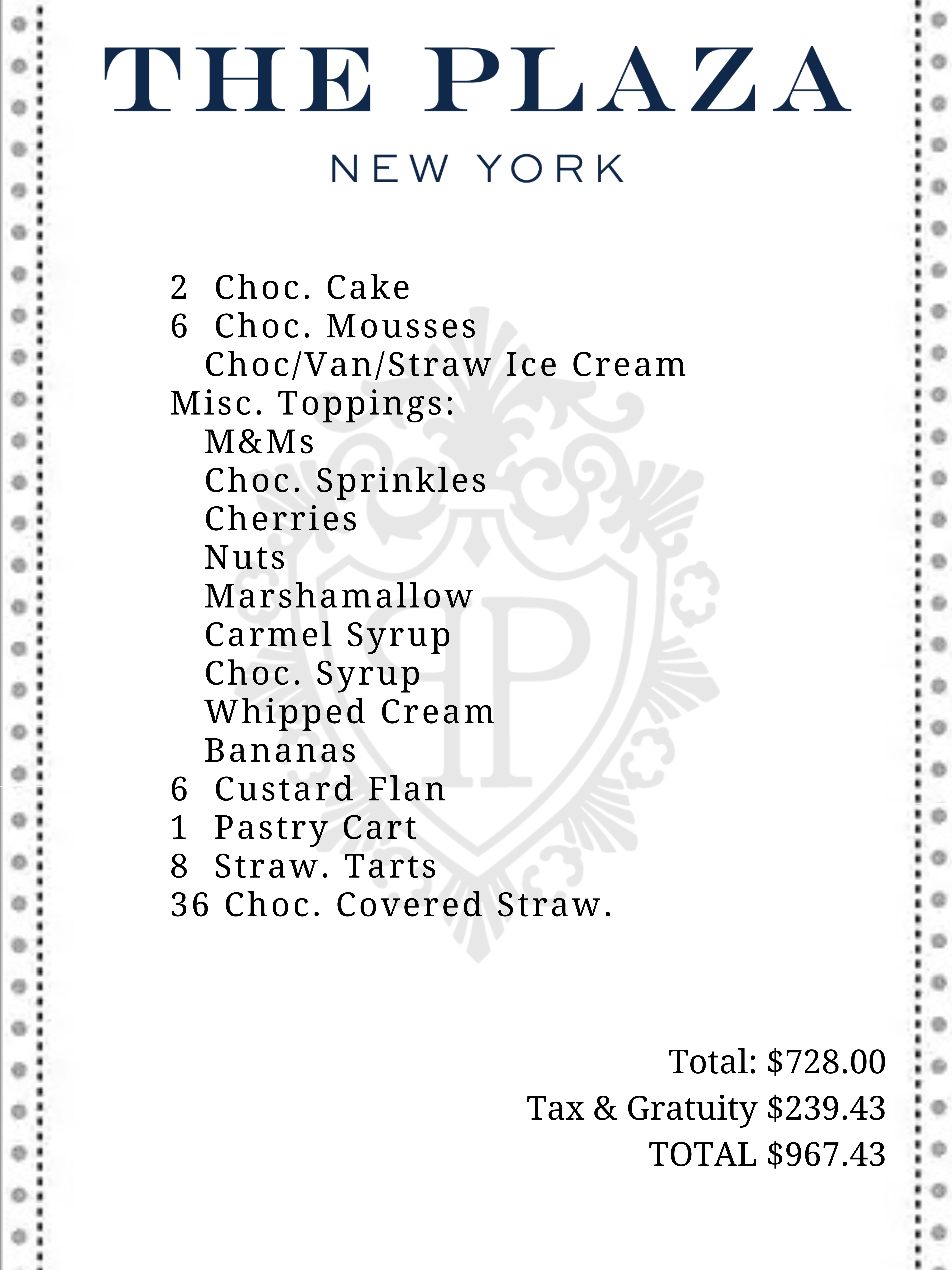 The table was filled with tons of items from the movie. This table runner is made to look like room service receipt from Home Alone 2, when he ordered ice cream and tons of toppings. You can download this file I created and upload it to offercustom for them to make it. Be sure to duplicate the picture all the way down the entire length of the runner.